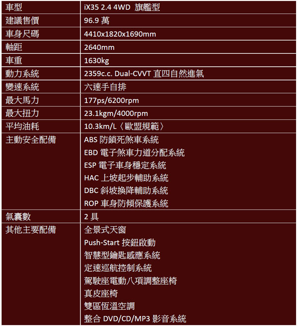 在本次的集評中,我們在iX35車系中選擇了搭載了柴油動力的iX35 VGTurbo進行測試,主要是在同一價格帶中,選擇三款搭載不同動力系統設定的車款,可做出更明顯的區隔,然而在iX35車系中,同在90~100萬價格帶中,另有搭載2.4升自然進氣汽油引擎的iX35 2.4 4WD旗艦型選擇,但建議售價部分略高於iX35 VGTurbo一萬元,為96.9萬,為iX35車系中價格最高的一款。