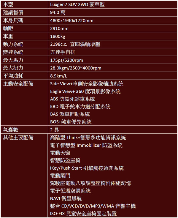 Luxgen7 SUV是台灣自主品牌Luxgen所推出的第二款車型,以結合了台灣汽車與IT兩大產業優勢,打著智慧車的名號,成功在市場上創造話題,配載之Think+智慧多功能資訊系統是最大的特色,同時還導入Side View+車側安全影像輔助系統,Eagle View+ 360度環景影像系統、Night Vision+高感光度輔助系統、LDWS+行車偏移偵測警示系統等安全輔助配備,領先國產車壇。