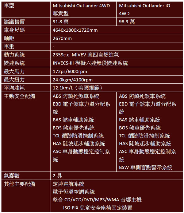 2008年在台灣國產上市的Outlander,被視為日本Mitsubishi的振興大作,也是Mitsubishi首度於台灣投入國產SUV市場的首款車型。相較於本次級評的三款國產SUV,世代上有所差異,不過相對的也是目前國產SUV中,除了即將退役的Ford Escape以外,產品最為成熟的車款。