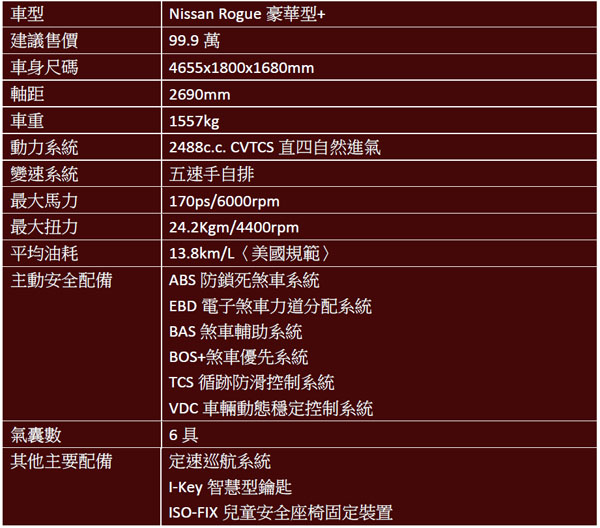 在台灣引進的Rogue車系中,符合本次百萬內SUV條件的車型引有一款,為豪華型S+,建議售價為99.9萬,配有六具氣囊,VDC車輛動態穩定控制系統等配備,比起多數國產SUV於安全配備上更為完善。同時還具備All Mode 4X4i智慧型全時四輪驅動系統,同樣具有一定程度的越野能力。