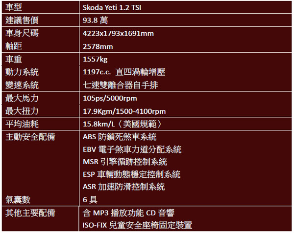 而在Yeti車系中,建議售價符合本次設定的車型為Yeti 1.2 TSI,最大的特色就是搭載了一具1.2升的小排氣量引擎,搭配渦輪增壓系統,與雙離合器變速系統,迎合了當前downsize的趨勢,即使最大馬力僅有105hp,但是在雙離合器變速系統的傳輸下,卻擁有高效率地動能表現,加上在稅負上的優勢,讓Yeti獨具不同地吸引力。