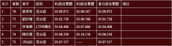 在混合組的成績中,駕駛Civic的姜孝青再次證明了Civic仍然是LTNS龍潭賽車場的地頭蛇,以1分00.972秒的時間拿下混合組的第一名。以BMW 318ti參加比賽的劉奕增則以1分01.738秒的單圈時間緊追在後。而車齡較高的Mini,則是在上午做出1分07.537秒的單圈成績,不過由於天氣炎熱的緣故,下午並未再次做出成績,實屬可惜。