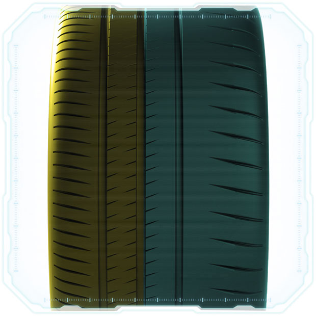 實際的體感做了最清楚的證明,Pilot Sport Cup 2的確可以滿足一般街道與賽道的雙重需求,但為何Pilot Sport Cup 2能有此能耐?其時在肉眼看的到與看不到的地方,都作了相對於Pilot Sport Cup+極大的革新。首先的雙胎面複合配方科技,於胎面內外側導入兩種不同橡膠配方,外側採用「高分子鏈」彈性體橡膠,提供過彎時最需要的乾地抓地性能,而內側則運用剛硬橡膠配方,藉此提升操控精準性,進而達到縮短賽道單圈成績秒數及提高整體穩定性之目的。根據賽道實測,Pilot Sport Cup 2相較於Pilot Sport Cup+,於西班牙Jerez Track 乾地賽道上的單圈成績整整快了1.8秒之譜 (測試車輛為Porsche 997 GT3)。