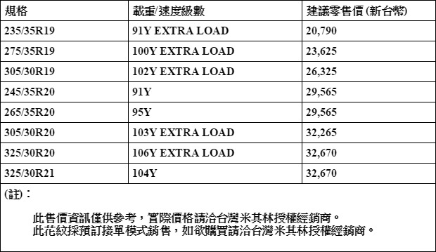 Michelin Pilot Sport Cup 2建議零售價格及供應規格