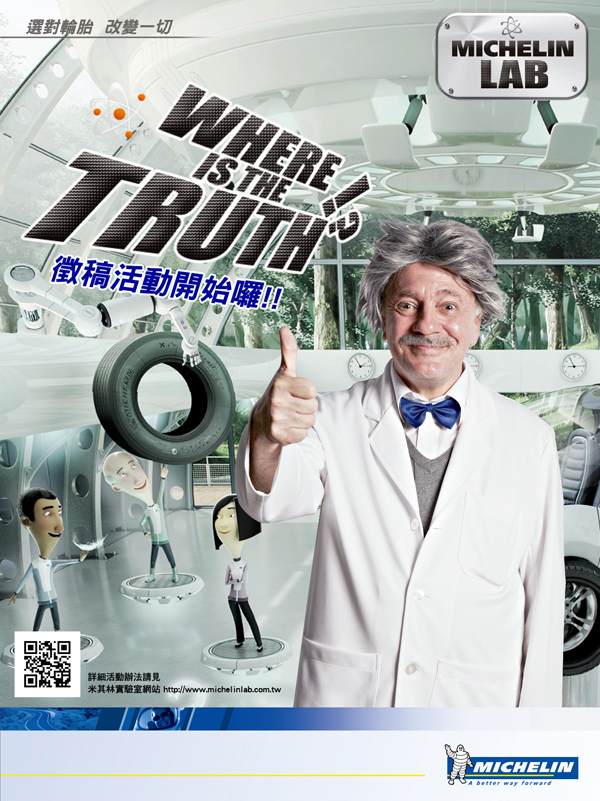 為了持續宣導輪胎安全之重要性,以及最先進的輪胎科技新知,同時讓國內廣大的消費者對於輪胎產品有更深的認識,台灣米其林將從8月1日起正式推出「米其林實驗室(MICHELIN LAB)」網路影片徵稿活動,藉由創新的網路行銷手法和媒體宣傳,在實驗室主任Dr. Wheel的帶領下,配合「米其林實驗室」官方網站的首支趣味實驗影片上線,即將在網路上為本次徵稿活動掀起一波話題性討論並創造曝光聲量,進而宣導米其林輪胎在操控抓地力、省油高里程、寧靜舒適度等方面的優越性能!