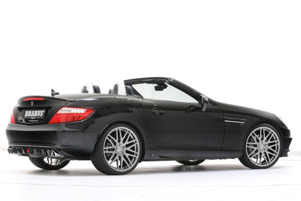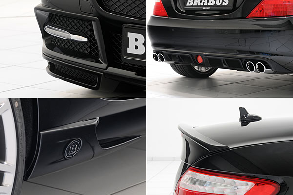 針對新世代SLK,Brabus按照慣例打造由裡到外一系列的改裝套件選擇,從外觀開始,全車空力套件以前下擾流帶領,左右分離式的設計包圍著原有兩側的晝行燈組,在不影響原有設計下有效提升高速行駛時的車身穩定性;除了同樣具有氣流導引效果的側裙外,車尾也加掛了鴨尾型的後尾翼與下分流器,分流器同時整合專屬不鏽鋼材質的左右四出式排氣尾管,對於排氣聲浪飽和度的提升與引擎的吐納將更為有利。