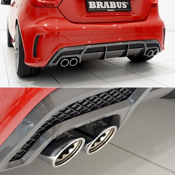 全不鏽鋼材質的Brabus運動化排氣系統,為左右各兩具鍍鉻尾管的設計,此排氣系統並適用於所有A-Class引擎族;這套系統提供運動化、卻不擾人的排氣聲浪展現。