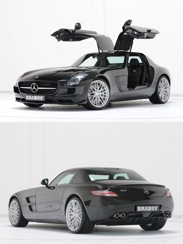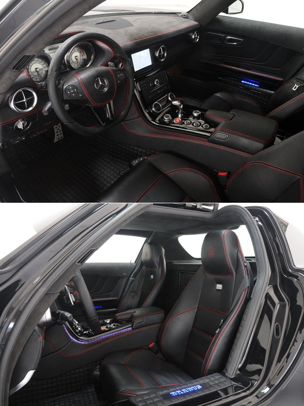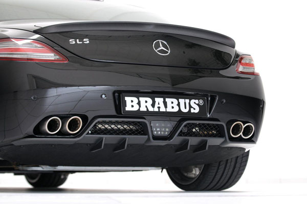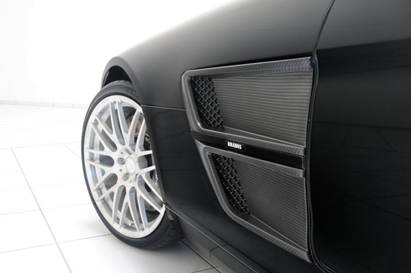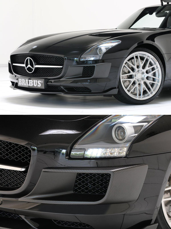 從近來於電視上強力播放的廣告可以發現,於隧道中360度翻轉駕駛的SLS AMG,強調的是其強悍性能與優異空氣力學,在此基礎上,要進一步的設計其空力套件,Brabus當然也經過了嚴苛與精密的風動測試,並以質堅量輕的碳纖維作為選擇材質,打造出整套外觀專屬空力套件,包含有車頭水箱罩兩側的氣壩集氣罩、下方的下擾流、側裙、車側散熱孔的碳纖維飾框、後下分流器與小型鴨尾型尾翼等,除了提供霧面碳纖維外觀外,也提供亮黑色的式樣選擇。