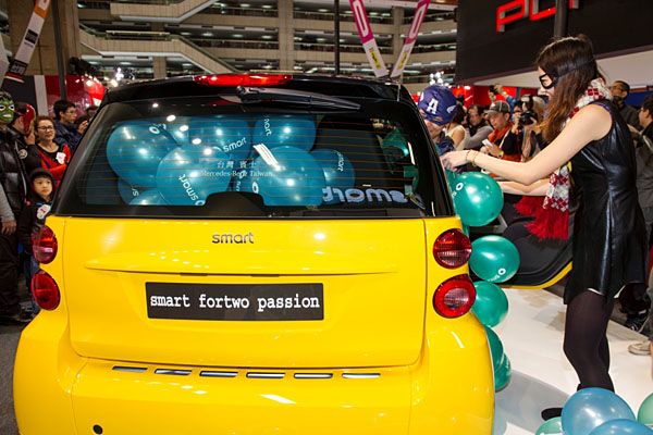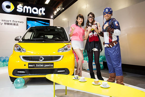 搞怪精神無人能敵的smart品牌,延續今年中smart以「城市英雄」所號召的車友大會師精神,於車展中號召了車迷朋友前來變裝赴會,果然吸引了各界英雄,如好萊塢英雄電影的蝙蝠俠、美國隊長、鋼鐵人,還有蜘蛛人等等!而以超能甜心身分擔任一日店長的當紅女星簡嫚書,則是以一襲可愛甜美的超能力女孩裝扮,難得展現她嬌小卻比例勻稱的迷人身材!讓首日開放一般民眾進場的台北車展,充滿了無窮活力!