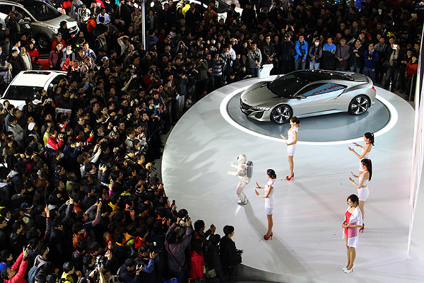 不是有著輪子的交通工具,也不是穿著清涼的車展Model與Show Girls,Honda的展區還有另一個吸引目光的焦點,他就是Honda所開發的人形機器人Asimo。而且Asimo不僅只是靜態展示,還會在每個半點現身Honda展場跳舞表演,展現Asimo的魅力。