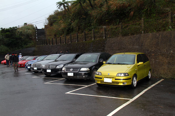 約清晨七點自木柵動物園出發的車隊陸續抵達北宜紀念碑公園停車場。
