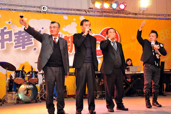 中華汽車三位重要高層於台上向所有同仁敬酒,左起分別為常務董事林信義、總經理嚴凱泰與執行副總劉興臺。