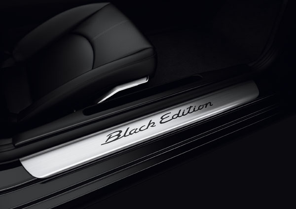 除了外觀之外,內裝同樣以黑色雕琢。不鏽鋼門崁車型踏板上的黑色「Black Edition」字樣帶您進入純粹的黑色空間,標準配備的雙肋造型跑車方向盤施以握感強化與柔感真皮處理,而儀表板的縫線、排檔桿與中央面板控制按鈕也皆為黑色。黑色的部分真皮座椅(椅面為Alcantara材質)施以保時捷盾形頭枕徽飾,當然您也可以選擇全黑真皮內裝。手套箱上方的限量生產銘牌彰顯其Black Edtion的不凡身分。
