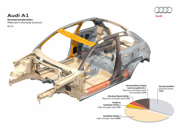 儘管身為Audi家族中體型最小的成員,但A1在安全性上仍不妥協,除了車體結構採用超高強度鋼材來達到高抗扭矩及輕量化的訴求外,包含底盤、B柱及車頂等全車約11%的結構,原廠更採用熱成型鋼材來大幅強化。