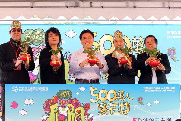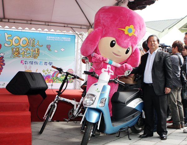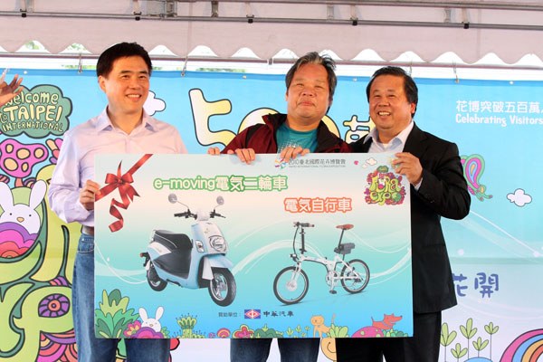 e-moving電気二輪車誕生於2010年,是以汽車造車工藝的高標準為顧客所打造的綠色代步工具;繼中華汽車為花博盛會量身訂做符合花博精神的警察專屬巡邏車,供警員在會場巡邏及公務使用後,完全幅合花博節能減碳環保主題、目前電動機車市占率第一的e-moving電気二輪車也獲花博青睞成為本次破五百萬人次最大獎項。為了拿到抽超級大獎「e-moving電気二輪車」及「e-moving電気小折」的幸運券,一早花博入口處就擠滿準備進入會場的民眾,最後終於在二月25日早上(9時5分)正式突破500萬人,拿到幸運券的民眾馬上聚集到舞台區,深怕錯失中獎機車,最後由郝市長抽出一位幸運的遊客,遊客獲獎後笑的合不攏嘴,直呼太過癮了。