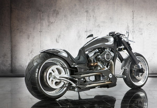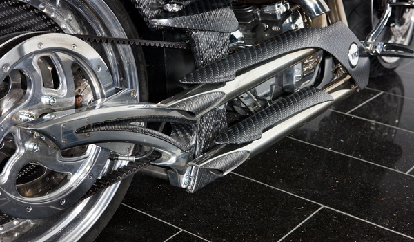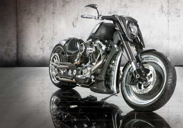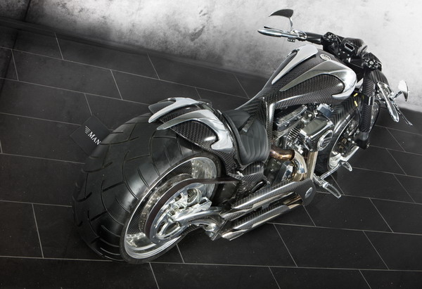 除了全車都是在位於巴伐利亞的工廠以手工打造之外,Mansory要一部好看的手工摩托車,便找來了知名的改裝摩托車設計師Thomas M. George來助陣,以大量鋁合金搭配碳纖維材質來包覆全車的套件,從昆蟲概念的油箱、輪圈、車頭面罩、前叉到排氣管的消音器無一倖免;另外皮革當然也是Mansory的拿手戲,細膩削薄的皮革座墊以如同肺片的設計相當獨特。