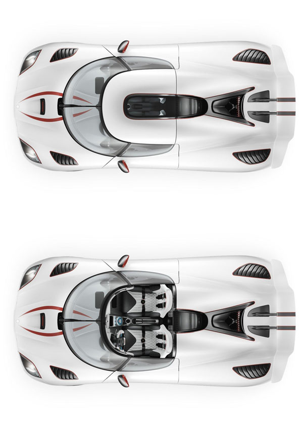 於日內瓦車展同場加碼的Agera R,車身基礎大抵建立於Agera基礎上,為求炫目的出場效果,仿效了改編自日本漫畫的知名電影Speed Racer中主角坐駕的塗裝,白色基底的設計,繪上了紅色線條的點綴,且為呼應著Agera那獨有的車身設計與碳纖維材質,於車側導流孔下方更搭配上黑色塗裝,以白/黑/紅三色勾勒出Agera R的視覺重點。