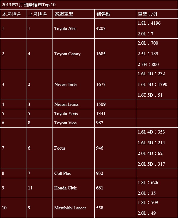 不過讓Toyota較感欣慰的是,旗下另一輛銷售長青樹Camry於7月份有著出色表現,以1685輛的銷售總量,讓其從6月份的第4名一次前進兩名,將連續多個月佔據亞軍位置的Nissan Tiida擠下,讓其品牌的中大型房車穩坐國產轎車銷售前十傑的前兩個名次。至於Toyota旗下另兩個銷售王牌Yaris與Vios,前者已連續多個月穩坐第5名的位置,7月份也不例外;而Vios應也受此波販促活動的影響,讓其從6月份的第8名一次躍升兩個位置,來到7月份的第6名,意味著銷售排行榜中,前6名中Toyota便占了4個名次。