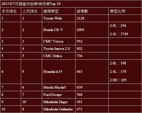 國產休旅車與商用車的銷售排行中,與6月份相同,7月份表現仍是變動有限。在第1名至第5名中的排名順序沒有變化,但其中冠軍龍頭的Toyota Wish以2128輛的成績,較前一個月與前一年表現皆有進步,更讓表現大爆炸的Honda CR-V仍能無法成功突圍,僅能以亞軍作收。