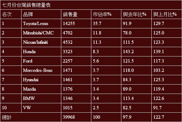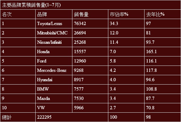 至於一至七月累積銷售量部份,前十名的排位乍看幾乎底定,其實包括2、3名的Mitsubishi/CMC與Nissan/Infiniti,以及8、9名的BMW與Mazda部份,不是後勢此消彼長如前者,就是兩方數據極度接近如後者,這都是下半年值得注意的方向。