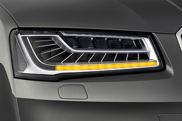 如同先前所揭示過的矩陣式LED頭燈,這次Audi所揭露的小改A8頭燈細節,輪廓便是7月時所發表的頭燈造型,這也表示了小改款A8將會導入這款矩陣式LED頭燈進入配備清單之中。擅長使用LED照明技術的Audi,運用25具高強度的LED發光單體,並以5個單體為一組的模式,搭配一組反光鏡,運用電子控制機構控制投射的角度與照明亮度,組成小改A8的全LED頭燈。