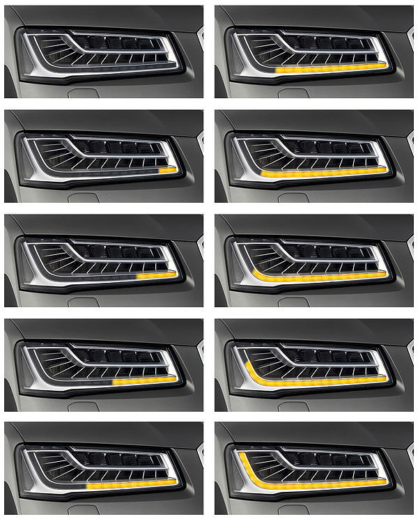 另外,Audi還導入新款的方向燈顯示模式,在頭燈運用18具LED發光單體,分成7組排列成帶狀,尾燈內則是以28顆LED發光單體,分為8組、同樣排列成帶狀。當撥動方向燈撥桿時,便會朝著所欲轉動的方向依序亮起,不若以往一亮一滅的閃爍指示,而是以動態流動的方式提醒週遭車輛的行進方向。