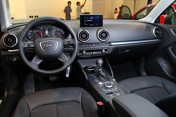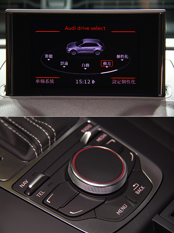 簡潔的中控台設計中,Audi將MMI系統的控制介面全數移往排檔座後方,包括旋鈕、按鍵等控制元件皆位於此處,並搭配厚度僅11mm的薄型化收納是液晶螢幕,創造質感甚佳的車室氛圍。Audi Taiwan為臺灣市場A3 Sportback所選擇作為標配的,同樣是中文化MMI多媒體操控介面。若是車主有所需要,Audi也提供MMI Touch觸控界面可供選擇,運用放大的MMI旋鈕頂端的平面,便能以手寫觸控的方式進行輸入。