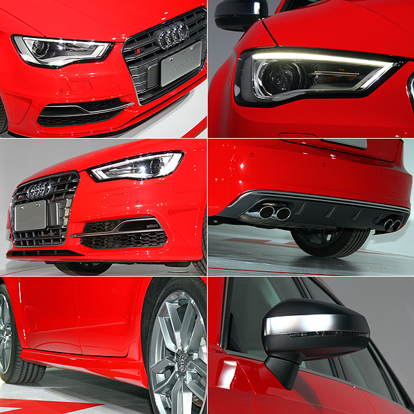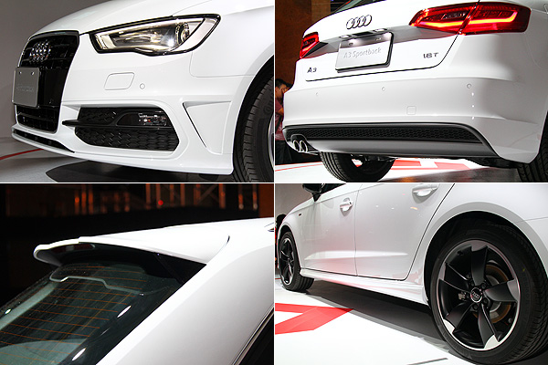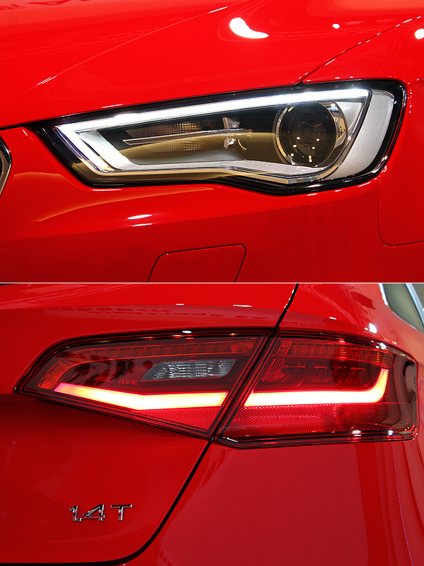 Audi引以為傲的LED照明科技是新世代A3外觀上的亮點,運用LED光條的轉折,於車頭仿效A1般的不規則多邊形輪廓頭燈中嵌入類似「> <」造型的LED晝行燈,並搭配中央的大面積單體式水箱護罩,創造動感的面容。車尾則是運用與高階車型類似的尾燈輪廓,以內部的導光條設計,創造明亮的尾部視覺感受。並運用無牌照框的設計,凸顯Audi的家族特色,使A3擁有明顯的品牌辨識度。