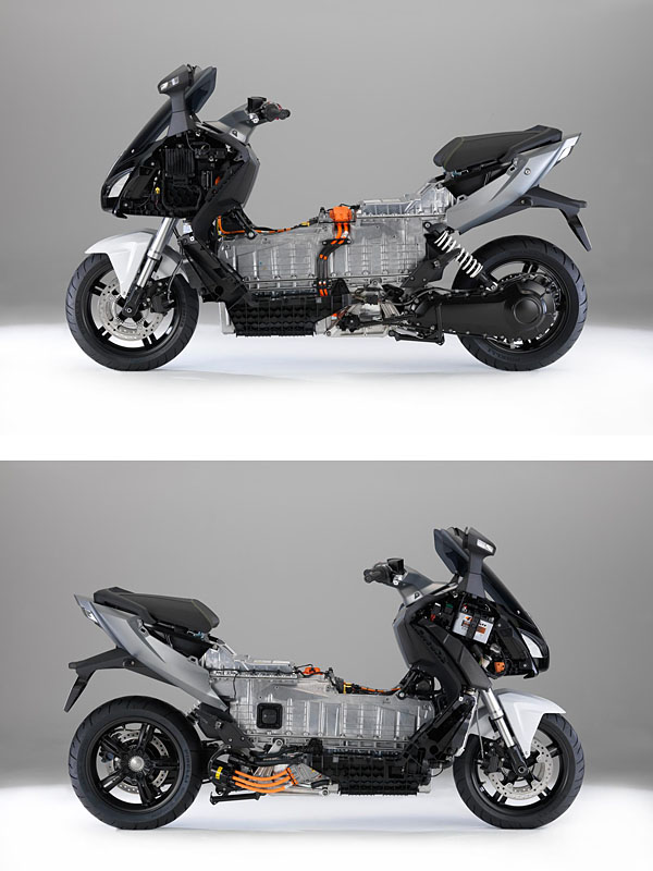 C evolution電動速克達導入8kWh的空冷式高壓鋰離子電池,上圖顯示電池與馬達的放置與相對位置。