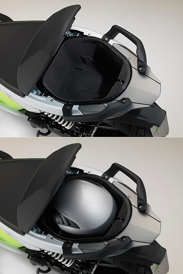 受限於電池體積,讓C evolution電動速克達的坐墊下置物空間僅能容納單頂安全帽的容積。