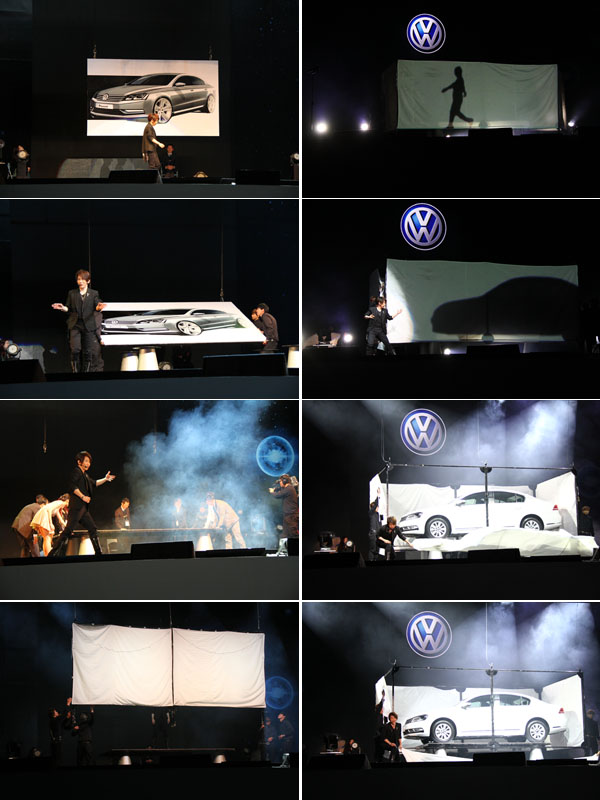 左上起為劉謙將Passat憑空變出的過程,由一張Passat的設計背板開始,架於四個支柱上,並由來賓檢察現場,蓋上布幕後劉謙先於其中確定無車,之後在全場驚嘆中看見Passat投影進入布幕之後,當掀下布幕那一刻全新Passat便於其中現身!