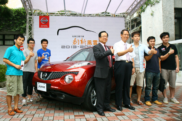 在全新跨界休旅Nissan Juke的輝映下,裕隆日產汽車李振成協理(右五)、台北科技大學李啟瑞副校長(右四),與北科大車輛工程系的學生們,都為「2013 – 2014裕隆日產汽車創新風雲賞」活動起跑儀式做了見證。