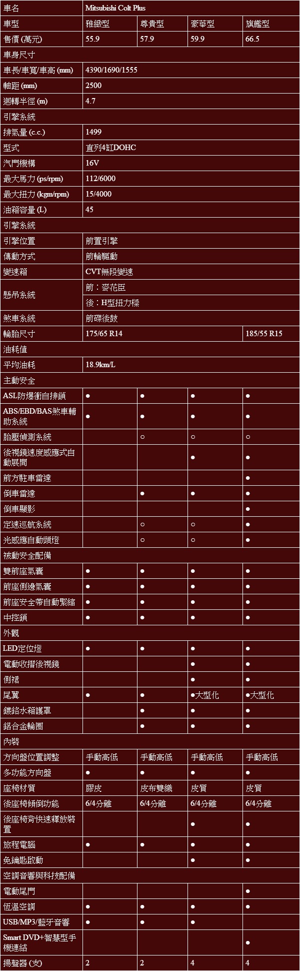 Mitsubishi Colt Plus規格配備表: