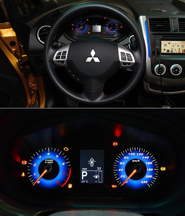 新式樣的3輻式多功能方向盤呈現與Lancer相仿的風味,儀表板則改為藍色背光,並且整合中央旅程電腦顯示螢幕。