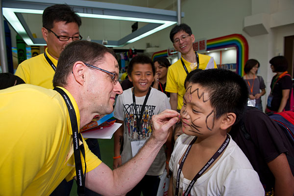 邁爾肯總裁玩心大起,與孩子在彼此臉上彩繪圖案。