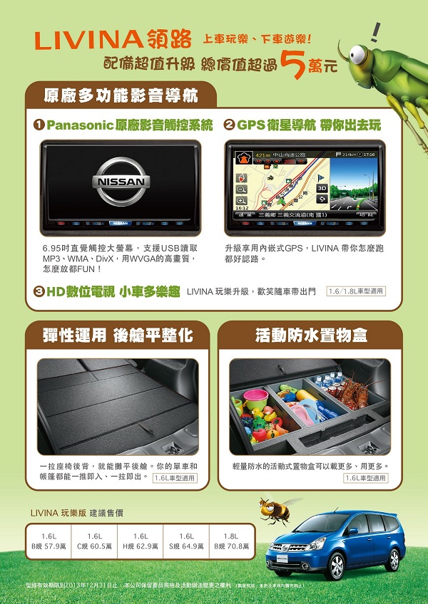 Nissan Livina並持續推出搭載豐富配備的特仕車款,像是即日起推出配備全面升級的Nissan Livina 1.6L、1.8L「玩樂版」特仕車,超值價新台幣57.9萬元起,搭載總價值超過新台幣5萬元的原廠多功能影音主機、衛星導航、HD高畫質數位電視及後艙平整化及防水置物盒套件(註1),本月入主同時可享高額分期零利率及六大系統八年不限里程延長保固優惠專案(註2)。