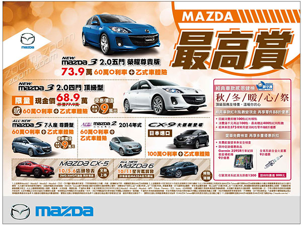 有關Mazda「最高賞」、「秋冬暖心祭」相關優惠訊息請洽全台Mazda展售服務據點,或上http://www.Mazda.com.tw Mazda官方網站查詢。