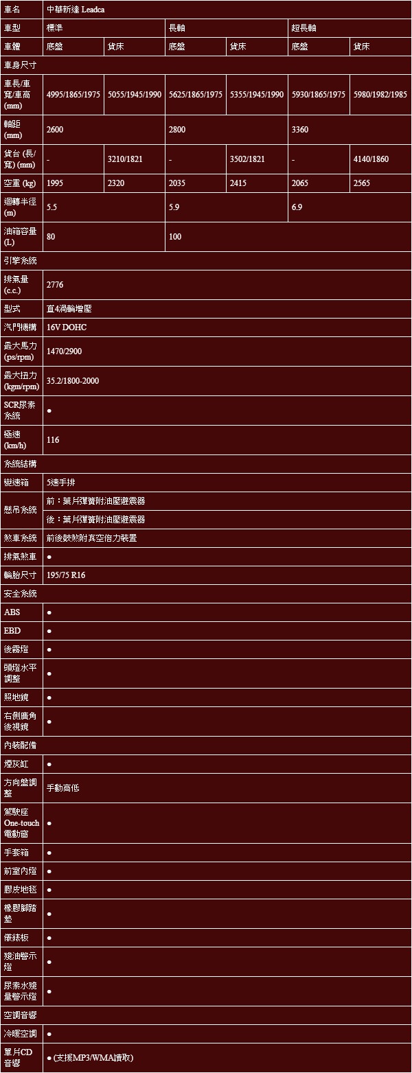 中華新達3.49噸規配表: