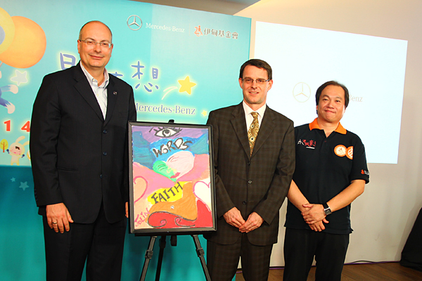 由左至右為台灣賓士資融總經理舒博特、台灣賓士總裁邁爾肯、伊甸基金會執行長黃琢嵩共同展示星夢想大使蔡依林手繪油畫創作-富足。