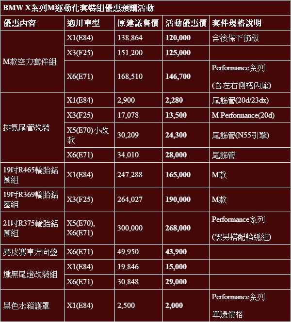 為了提供BMW X系列車主更加個人化、與眾不同的視覺享受,BMW總代理汎德公司將於2013年11月1日至12月31日推出「BMW X系列M運動化套裝組優惠預購活動」,車主除了能選擇M款空力套件組、排氣尾管改裝組、輪胎鋁圈組等熱血外觀套件之外,麂皮賽車方向盤也為車室增添濃郁的運動氣息,加倍提昇駕馭樂趣。詳細適用車型及優惠內容歡迎親洽汎德全台經銷商服務廠,妝點愛車的運動新風貌!