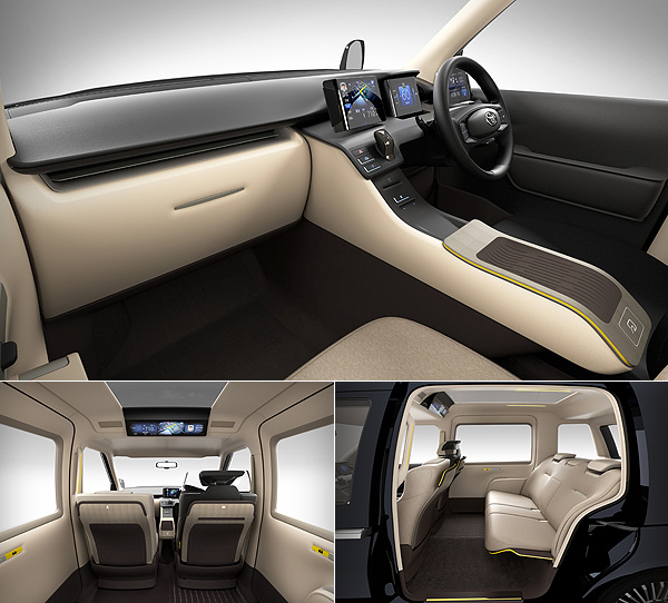 在類似MPV的車體架構之下,JPN Taxi Concept擁有寬敞的車室空間。同時,為了符合日本政府期望導入的無障礙計程車概念,JPN Taxi Concept採用了低底盤搭配電動側滑門的設計,讓老年人或小孩能夠輕鬆的進出車室。另外,車頂中央還整合有大型的顯示螢幕,能夠顯示票價與目的地間的路線資訊,讓所有行車狀況一目瞭然。