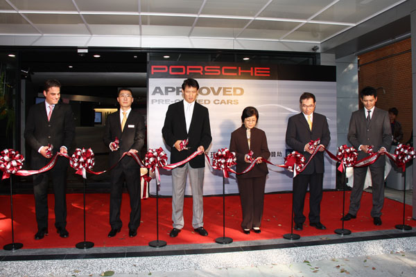 汎德公司常務董事唐如萱(右三)、總經理杜黃旭(左三)、永業汽車總經理李智龍(右二)、副總經理范台勵(左二)等人皆到場剪綵,見證Porsche認證中古車展示中心的開幕儀式。