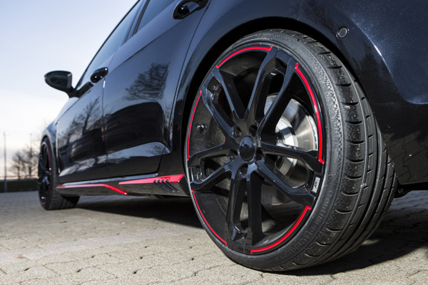 Dark Edition的設計概念運用在包括側裙、前保桿下擾流、尾門、後保桿總成、以及黑色烤漆的四管鍍鉻排氣系統上,質輕、動感的ABT CR鋁圈,其五輻十爪的輪輻,更完美襯托ABT Golf VII GTI Dark Edition不凡的個性,尤其當配置20吋鋁圈、以及235 / 30 R20高性能跑胎時更是如此。
