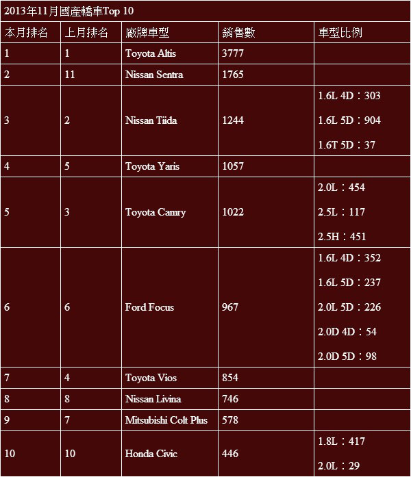 於國產轎車的排行榜中,於上市初期發出豪語,要與輔問世的三個月內衝出12500輛銷售成績的Toyota Altis,再度以3777輛的成績蟬聯龍頭,但加上上個月3572輛的數據,距離這目標似乎還有點差距,若無法在下個月迎頭趕上,爆量演出,可能有一定難度,但誰知道,畢竟是蟬聯多年銷售冠軍的Altis!