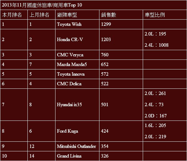 國產休旅車/商用車市場變化不大,前三名依舊是熟面孔,由Wish、CR-V、Veryca所分別奪得,而第4名的Mazda5受到小改款車型上市影響,並因增加了新入門車型,有效提升產品吸引力,一舉從上個月的第7名躍升三個位置,但能否繼續保持續航力,值得關注。