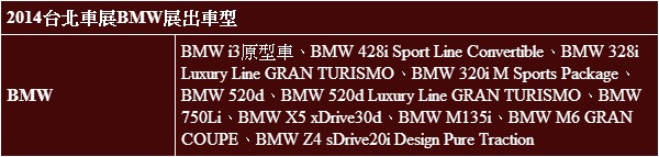 以「BMW創新科技」為本屆「2014台北車展」展覽主題,BMW總代理汎德公司隆重呈獻全新BMW i3-採用LifeDrive車體結構、eDrive智慧型電能驅動系統以及環保節能製程,全新BMW i3不僅實現純電行駛的永續理念,並擁有BMW經典的優異操控性能,展開都會移動的新時代!同時,御風而行的全新BMW 428i Sport Line敞篷跑車也將於「2014台北車展」首次在台亮相,而全新BMW 320i M Sports Package、BMW 328i GRAN TURISMO、BMW 520d、BMW 520d GRAN TURISMO、BMW 750Li、BMW M135i、BMW M6 GRAN COUPE、BMW Z4以及甫於今年11月上市之全新BMW X5皆將於「2014台北車展」中現身,BMW總代理汎德公司敬邀全台車迷朋友們蒞臨於2013年12月28日至2014年1月5日台北世貿一館舉行的「2014台北車展」,體驗BMW超前啟後的先進科技!