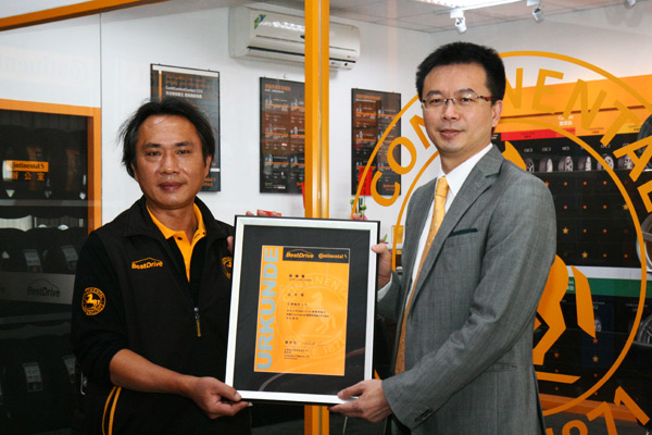 台灣開利耐特蔡明恩協理(右),將馬牌輪胎BestDrive旗艦店授權書正式交付予太聯輪胎負責人吳燕輝先生(左)。