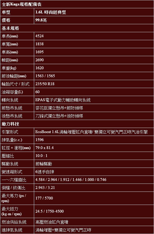 Ford Kuga 1.6L EcoBoost時尚經典型基本規格表