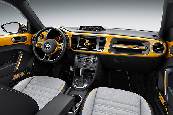 車內Beetle Dune仍然保有現行Beetle的設計元素,與車身同色的車門、方向盤與儀表板飾板,依然擁有活潑的動感氛圍。不過在車門置物空間的地方,Volkswagen不僅改用彈性織布材質,還印上斗大的「DUNE」字樣。同時,在一般Beetle中被捨棄的手套箱把手,也再次回到Beetle身上,重溫Beetle的經典風情。另外,Volkswagen也為其引入7.7吋的觸控螢幕作為多媒體系統的核心,讓Beetle的經典設計有了另一種現代化的詮釋。