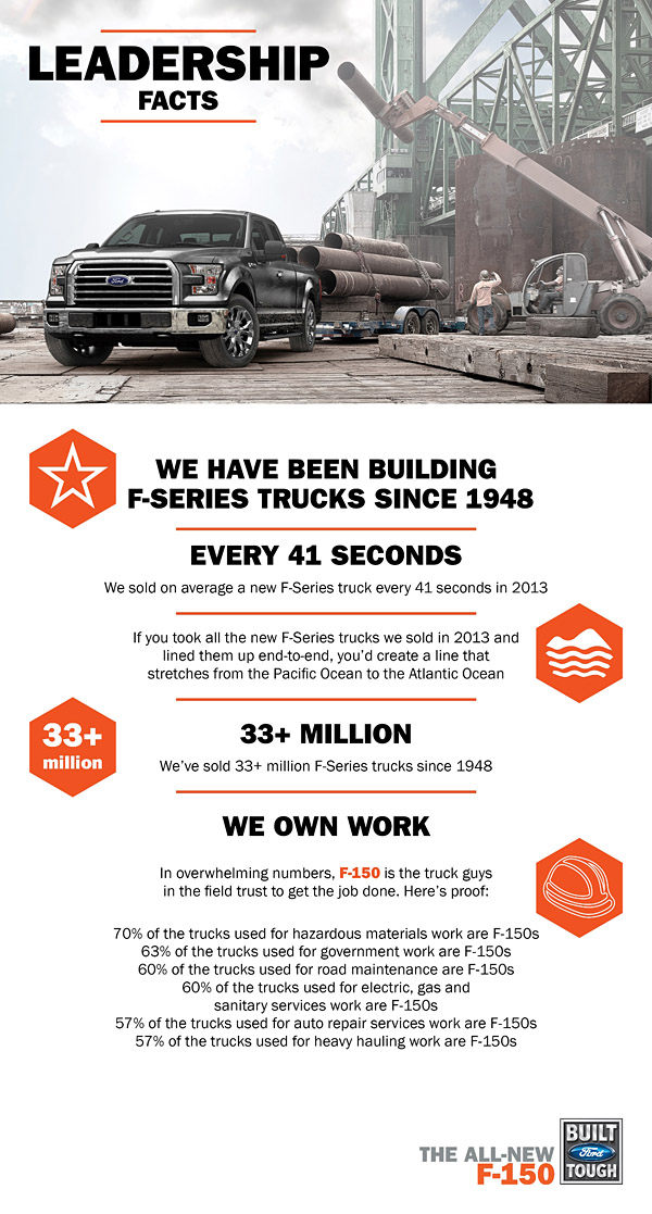 全新Ford F–150皮卡休旅車的所使用的高強度鋼材結構由現行販售版的百分之二十三,大幅增加到百分之七十七,打造出更堅固耐用且安全的車身架構。結合高強度鋁合金車身鈑件,減輕車身重量近三百二十公斤。如此不但提升車輛的加速性能、拖曳能力、與剎車性能,更展現絕佳平均油耗數據。